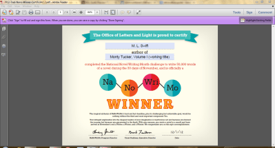 And that was NaNoWriMo 2012…my first. But hopefully, I’m not the only winner in this. If all works out, millions — nay, billions — of people all across the globe will come to know Monty Tucker, buying books on his adventures, watching the movie and sequels, collecting merchandise and selling it on eBay…that’s not asking too much, is it?